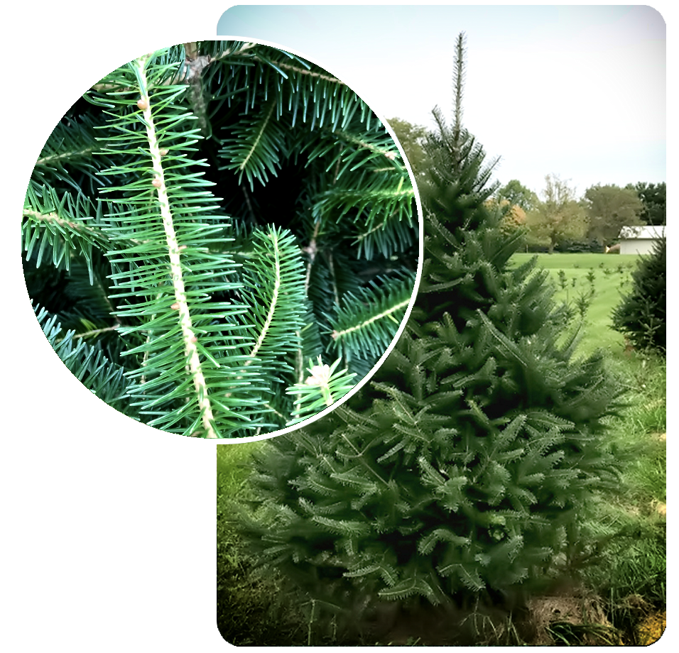 Short soft needles, 1/2" to 1” long, blue-green to dark green in color. Underside of needles and branches have a silvery color. Sturdy branches hold ornaments well.